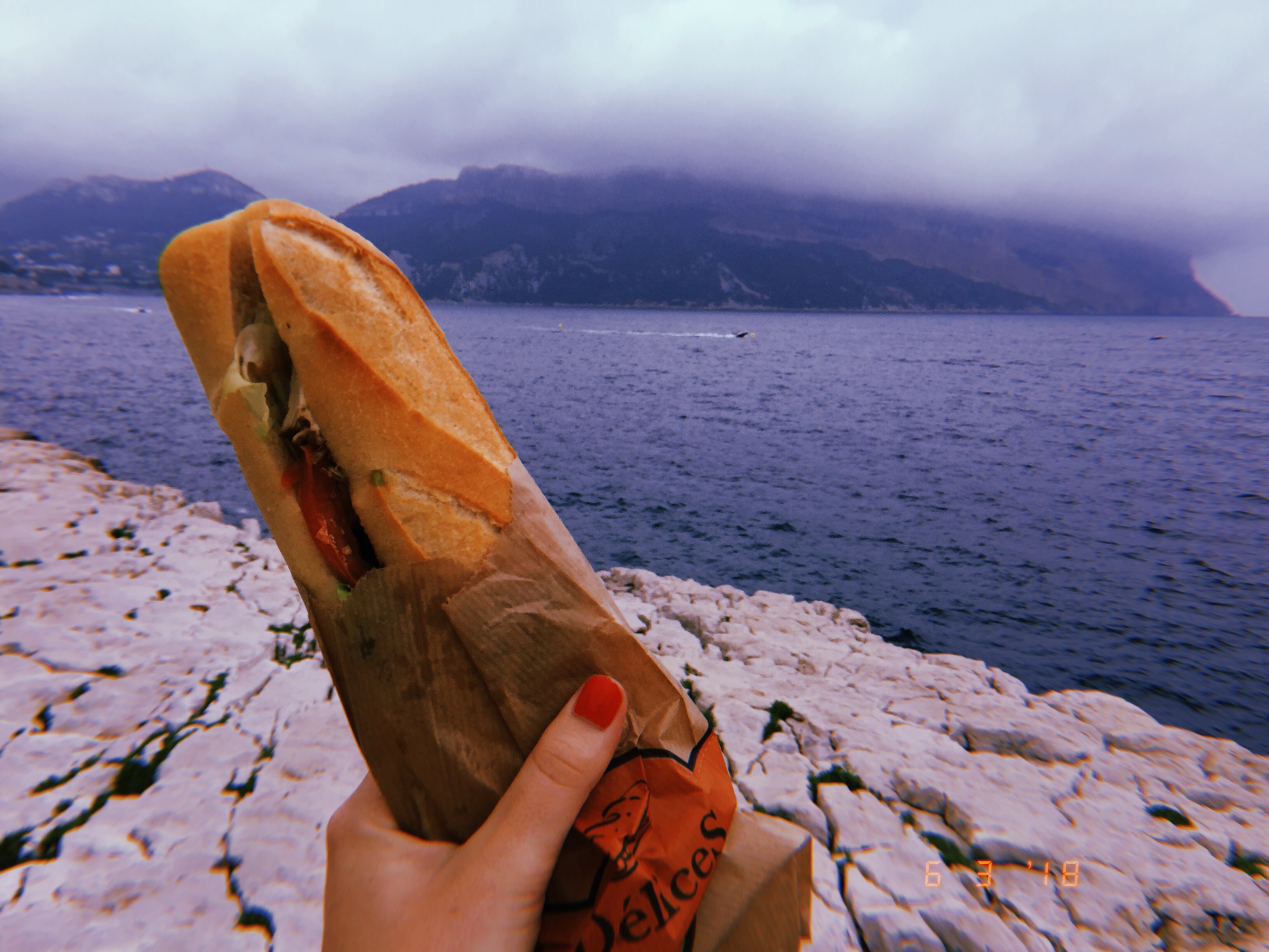 I love grabbing something to go and eating by the water. We got sandwiches in town and drove to eat them before our hike. If you like tuna, I don’t! I recommend a pan bagnat. It’s a type of sandwich thon crudité that is specific to Provence. It’s a round bun filled with salad, tomato, egg, olive and tuna.
